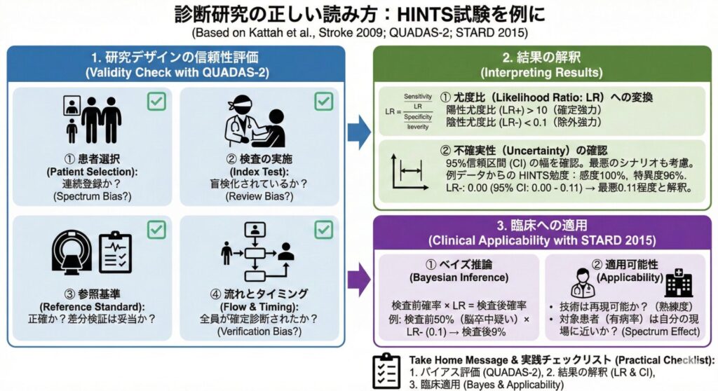 診断研究を読むときは、HINTSはすごい診断能の検査で終わらせず、なぜこの研究は信頼できるのかを以下のチェックリストで点検してください。