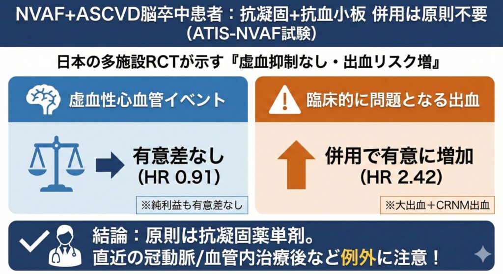 脳梗塞や一過性脳虚血発作(TIA)の既往があり、非弁膜症性心房細動(NVAF)と動脈硬化性疾患を合併する患者さんにおいて、抗凝固薬単剤に抗血小板薬を上乗せしても、2年間の複合アウトカム(虚血イベント+大出血)で優越性は示されませんでした(ハザード比 0.91, 95%信頼区間 0.53–1.55)。