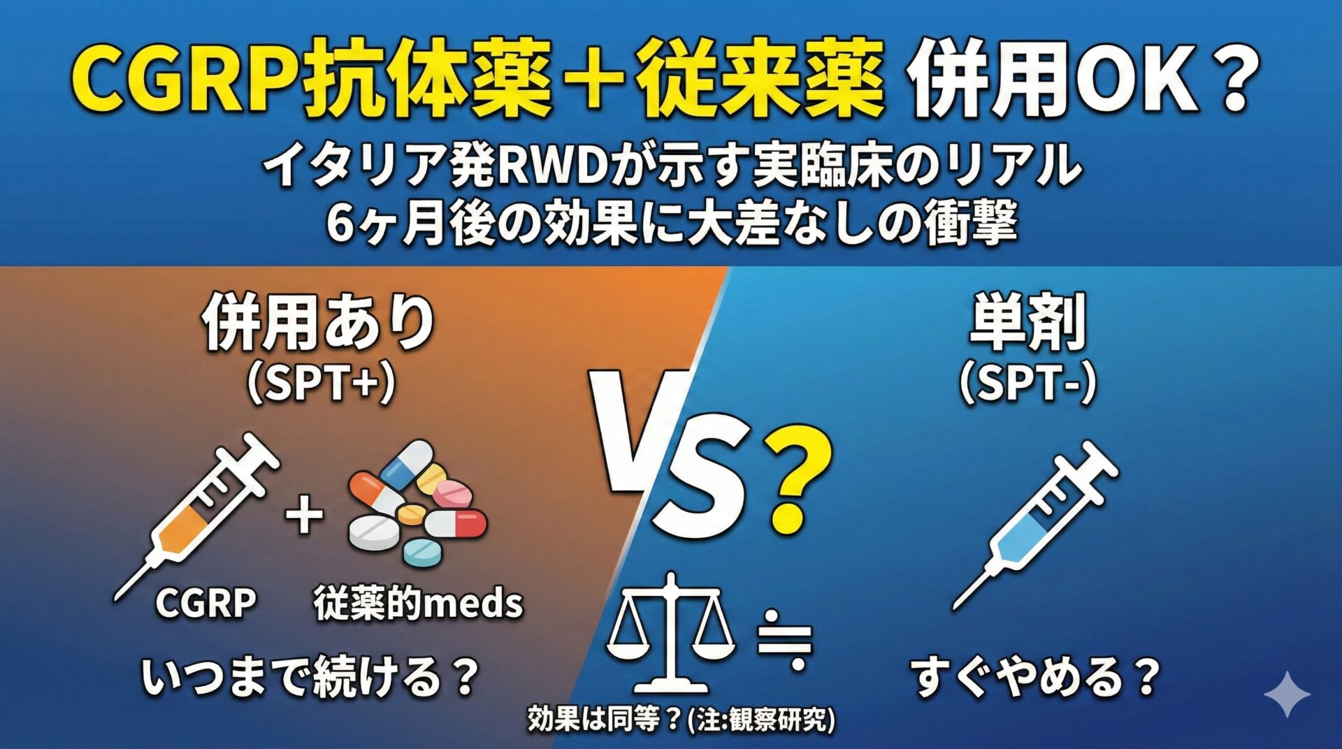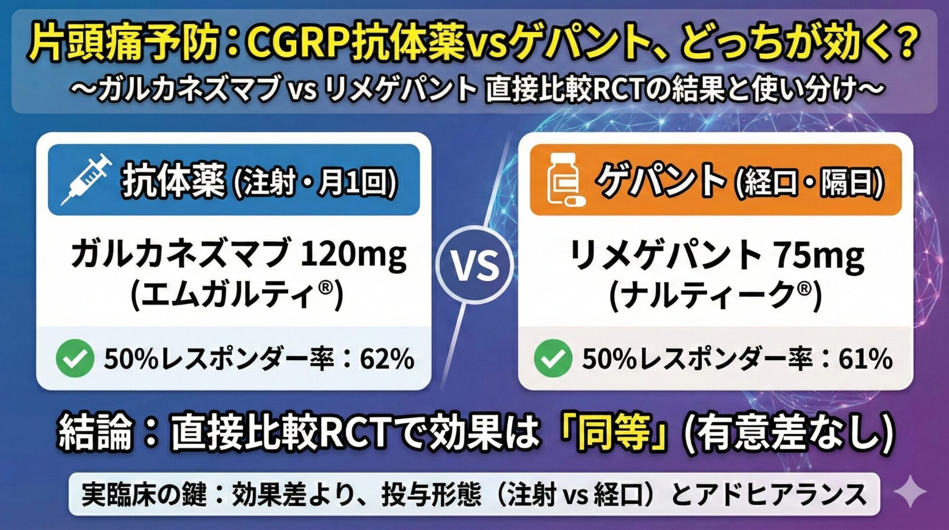 片頭痛予防にCGRP抗体薬とゲパントはどっちが効く? 〜ガルカネズマブ vs リメゲパント直接比較RCTの結論と実臨床での使い分け〜 2025.11.10 頭痛 Neurolog管理人 にゅ〜ろろぐ|脳の羅針盤