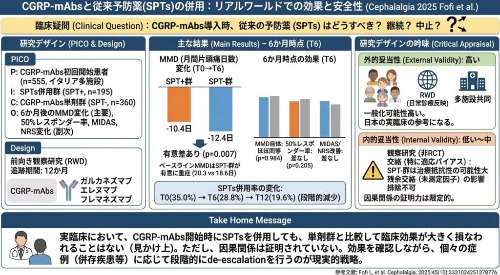 これらの要因により、SPT併用の有無がCGRP-mAbsの効果に(因果的に)影響しなかったと断定することは困難です。観察研究であり、内的妥当性には限界があります。