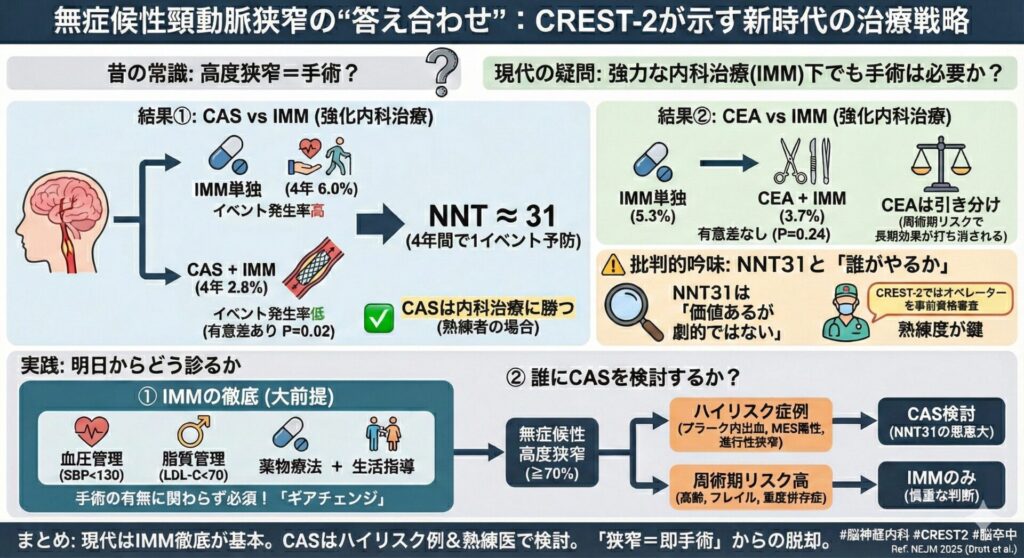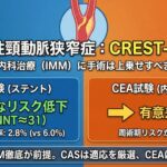 周術期リスクが長期的な予防効果を相殺している可能性がある。 - “高度狭窄がある=即手術へ紹介”の時代は終わり、全例でのIMM徹底とCASのベネフィットが得られるハイリスク群の慎重な選別(および熟練施設での治療)が求められる。