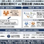 ネットワーク・メタ解析(Network Meta-Analysis: NMA)とは、多くの薬剤のRCT(例:A薬 vs プラセボ、B薬 vs プラセボ)の結果を統計学的に統合し、「A薬 vs B薬」のように直接比較試験が存在しない薬剤間の効果も間接的に比較する手法です。