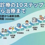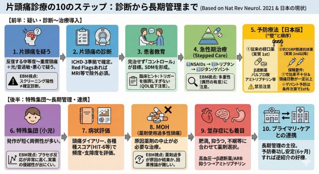 2021年に Nature Reviews Neurology 誌に掲載された、欧州の専門家パネルによるコンセンサス “10 Steps” をベースに、2026年時点での日本の保険診療と最新薬(CGRP関連薬・ゲパント)の事情を反映しました。