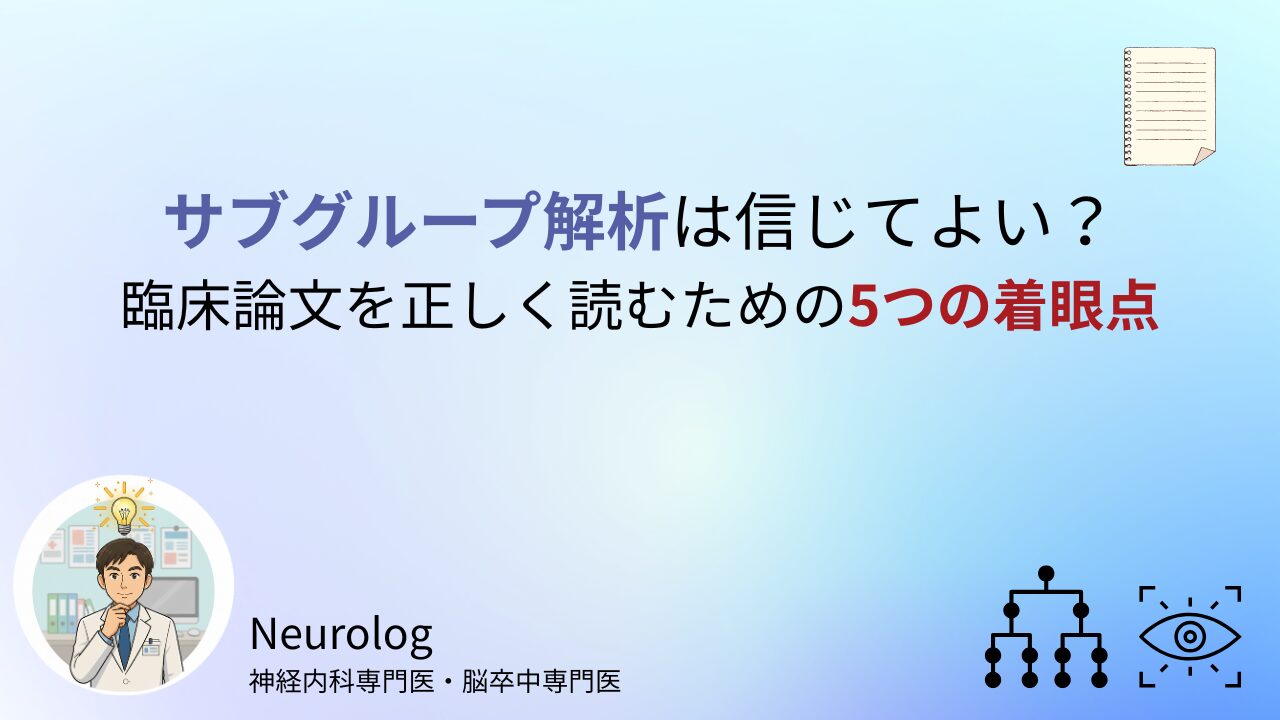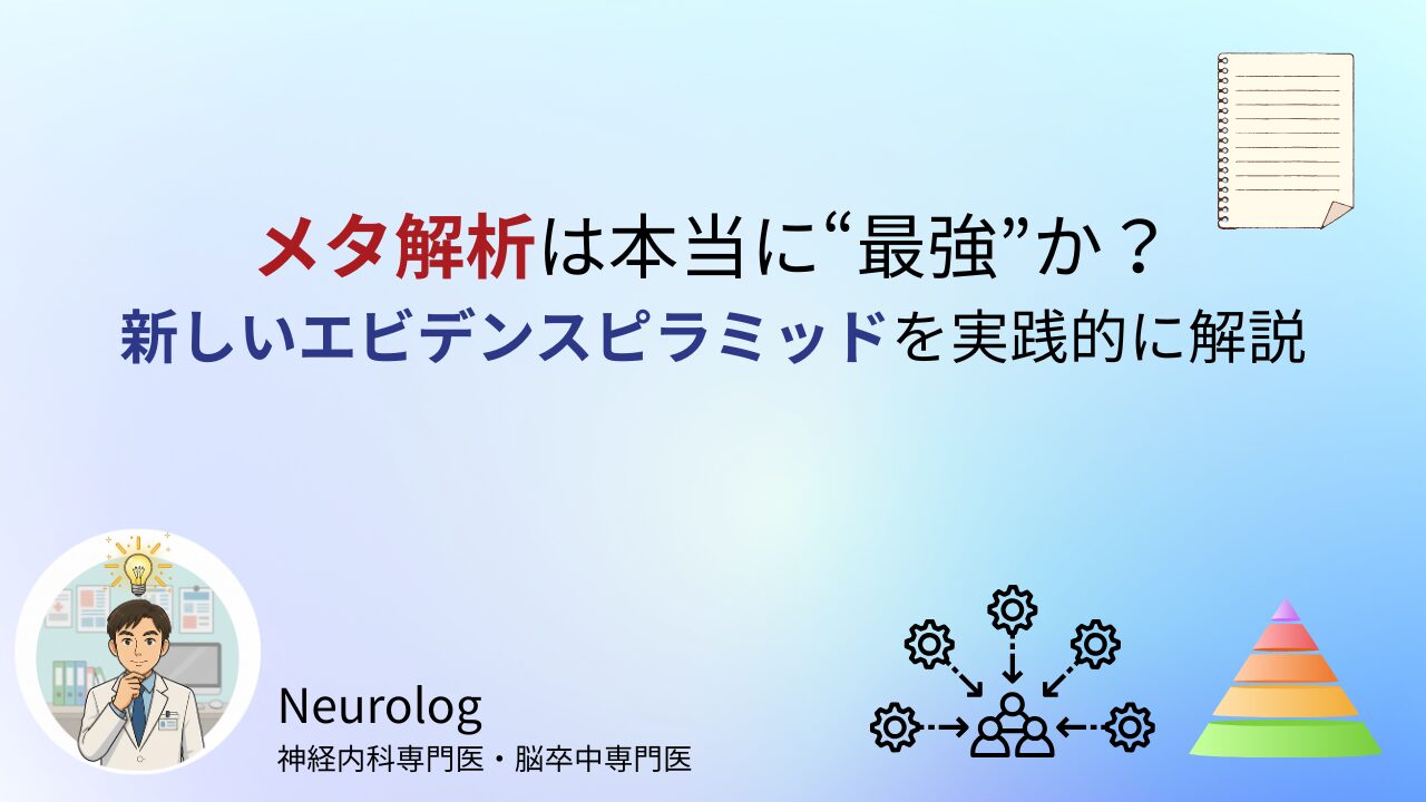 神経診断の近道は“病名”ではない:病巣 × 機序で組み立てる実践フレーム 2025.10.16 その他 Neurolog管理人 Neurolog|脳の羅針盤 サブグループ解析は信じてよい?臨床論文を正しく読むための5つの着眼点 2025.10.15 臨床疫学 Neurolog管理人 Neurolog|脳の羅針盤 片頭痛予防にカンデサルタンは有効?—大規模RCTの結果と国内での使い方 2025.10.14 頭痛 Neurolog管理人 Neurolog|脳の羅針盤 髄膜炎・脳炎パネルの診断精度と限界:メタ解析で検証する臨床での賢い使い方 2025.10.13 感染症 Neurolog管理人 Neurolog|脳の羅針盤 心房細動+動脈硬化を合併した脳梗塞の最適な抗血栓療法は?― ATIS-NVAF試験が示した「併用の純利益なし」― 2025.10.12 脳卒中 Neurolog管理人 Neurolog|脳の羅針盤 ギラン・バレー症候群の予後不良例にIVIg追加は有効か?SID-GBS試験(RCT)を実践的に解説 2025.10.11 筋・末梢神経 Neurolog管理人 Neurolog|脳の羅針盤 メタ解析は本当に“最強”か?新しいエビデンスピラミッドを実践的に解説 2025.10.10 臨床疫学 Neurolog管理人 Neurolog|脳の羅針盤 特発性全般てんかんの女性、第一選択薬はレベチラセタム?ラモトリギン? 2025.10.09 てんかん Neurolog管理人 Neurolog|脳の羅針盤 成人MOGAD:初回イベント直後からの維持療法で再発は減らせるか?—フランス全国コホート MOGADOR2 2025.10.08 免疫 Neurolog管理人 Neurolog|脳の羅針盤 パーキンソン病、神経内科医が診ると予後は変わる? ― Neurology誌の2研究で読み解く専門医の役割 2025.10.07 変性 Neurolog管理人 Neurolog|脳の羅針盤 12…345