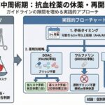 - DOAC: PAUSEプロトコルを参考に、ブリッジなしで管理する(低リスク1日前、高リスク2日前休薬)。